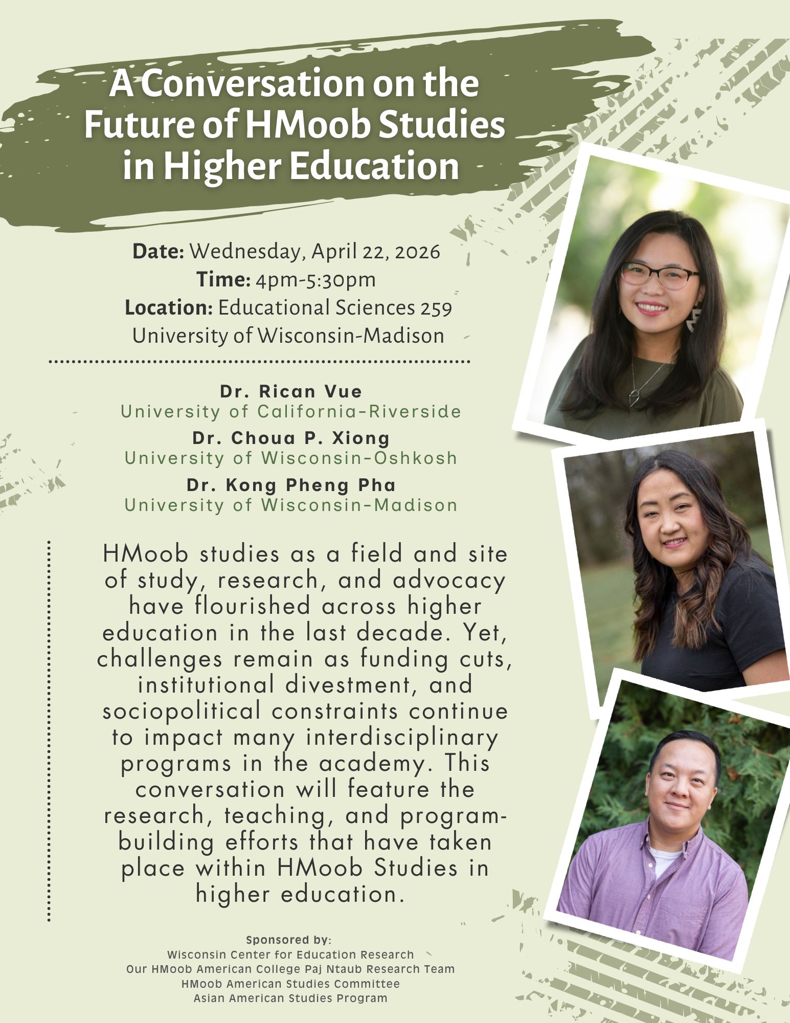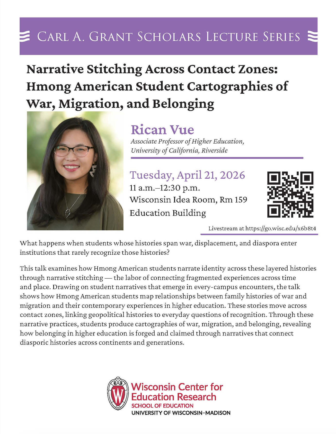 Please join Dr. Rican Vue on her talk through the Carl A. Grant Scholars Lecture Series. In this talk she will be examining how Hmong American Students narrate identity across layered histories thorugh narrtive stitching and draws from student narratives in every-campus encounters. These stories move across contact zones, linking geopolitical histories to everyday questions of recogntition and, through these narratives they reveal how belonging is forged and claimed